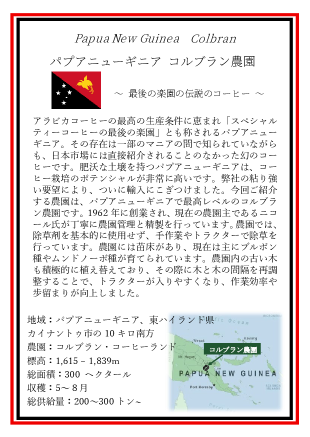 アラビカコーヒーの最高の生産条件に恵まれ「スペシャルティーコーヒーの最後の楽園」とも称されるパプアニューギニア。その存在は一部のマニアの間で知られていながらも、日本市場には直接紹介されることのなかった幻のコーヒーです。肥沃な土壌を持つパプアニューギニアは、コーヒー栽培のポテンシャルが非常に高いです。弊社の粘り強い要望により、ついに輸入にこぎつけました。今回ご紹介する農園は、パプアニューギニアで最高レベルのコルブラン農園です。1962年に創業され、現在の農園主であるニコール氏が丁寧に農園管理と精製を行っています。農園では、除草剤を基本的に使用せず、手作業やトラクターで除草を行っています。農園には苗床があり、現在は主にブルボン種やムンドノーボ種が育てられています。農園内の古い木も積極的に植え替えており、その際に木と木の間隔を再調整することで、トラクターが入りやすくなり、作業効率や歩留まりが向上しました。